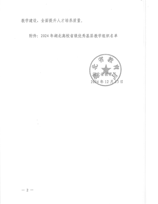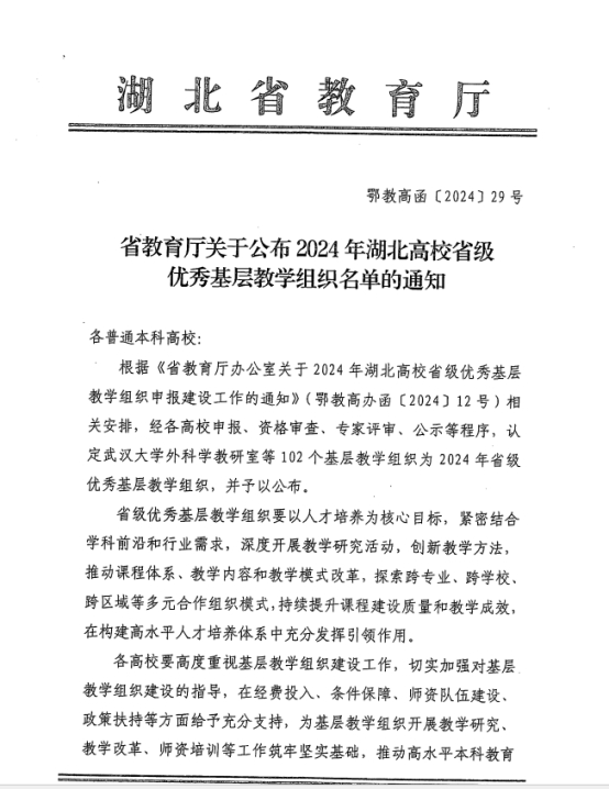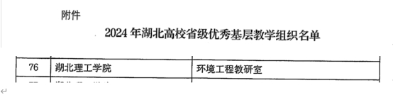 近日,湖北省教育厅发布了《关于公布2024年湖北省高校省级优秀基层教学组织名单的通知》(鄂教高函【2024】29号),我院环境工程教研室成功获批省级优秀基层教学组织。
