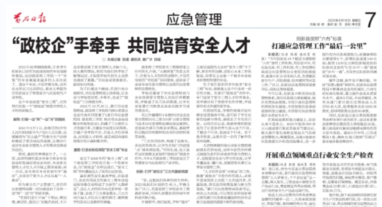 “校政企”深度融合、协同育人,实现平台共建、资源共享、人才共用,助推“政-产-学-研-用”良性循环,实现专业建设水平、人才培养质量、教师教学科研能力、政府监管效能、企业本质化安全水平五提升,通过合作充分发挥各方优势,共同推进为党育人,为国育才。