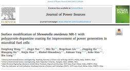 2021年1月,国际一流能源期刊Journal of Power Sources(一区,Q1,Top,影响因子8.247)刊登了题为Surface modification of Shewanella oneidensis MR-1 with polypyrrole-dopamine coating for improvement of power generation in microbial fuel cells的研究论文,报道了在电活性生物膜胞外电子传递效率优化方面的最新研究成果。共轭聚合物修饰产电菌是改善生物电化学系统中电活性生物膜胞外电子传递(EET)的有效方法。该研究采用聚吡咯(PPy)和胶黏剂聚多巴胺(PDA)对产电菌个体进行原位修饰。经PPy-PDA修饰的产电菌显示出更好的导电性和粘附性。将PPy-PDA修饰后的电活性生物膜用于微生物燃料电池(MFC)的阳极,阳极的电活性大大提升,有利于作为胞外间接电子传递中介体的核黄素分泌增加。该研究表明,用PPy-PDA对产电菌个体进行原位修饰,是改进MFC整体性能的一种简便而有前景的策略。汪东亮博士为论文第一作者。