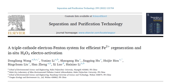 国际分离与纯化领域著名期刊Separation and Purification Technology (Sep. Purif. Technol) 于2022年7月在线发表了我校环境学院水处理电化学技术团队核心成员汪东亮博士 “A triple-cathode electron-Fenton system for efficient Fe2+ regeneration and in-situ H2O2 electro-activation” 的研究论文。研究创新设计了一种三阴极电芬顿系统并将其应用于有机废水处理。