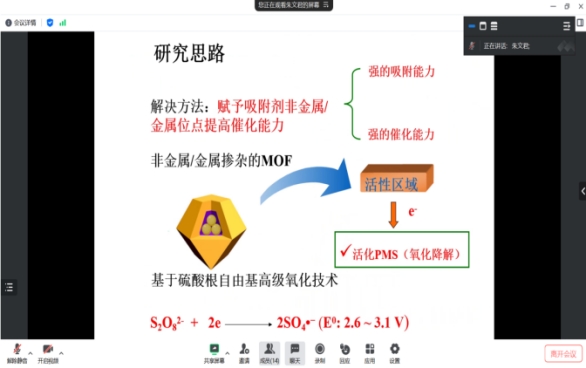 朱文君博士以《MOFs衍生碳基材料及其降解抗生素污染物的研究》为题进行进站汇报,报告以金属有机骨架(metalorganicframeworks,MOFs)为模板,在惰性气体氛围下高温煅烧得到杂原子掺杂多孔碳催化剂;通过改变功能性配体、载体以及碳化条件等调控多孔碳的缺陷结构、杂原子类型以及碳原子环境等,有利于增强多孔碳与目标污染之间的π-π作用、氢键作用以及静电作用等,提高其吸附能力。另一方面,向模板中引入载体有效减少高温处理过程中活性位点的团聚,提高复合材料催化能力,并同时研究了该体系吸附-催化反应机理与材料组成和结构之间的构效关系。