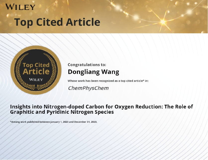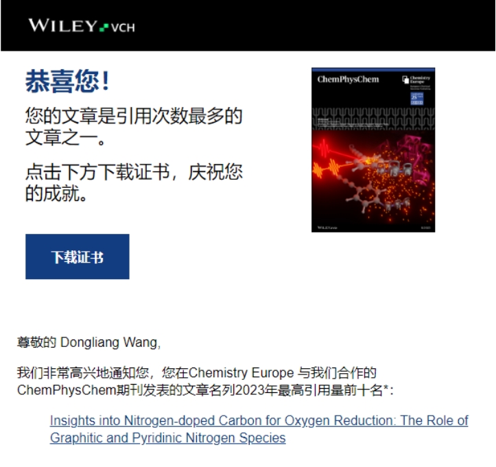 近日,国际知名出版社Wiley公布了旗下数据库2024年度Top Cited Article(年度最高被引论文),WilliamHill威廉希尔水处理电化学技术团队发表的一篇论文入选其中,Wiley发来证书表示祝贺。该篇论文为2023年发表在CHEMPHYSCHEM(化学物理化学)上的研究论文,第一作者为汪东亮副教授。论文名列CHEMPHYSCHEM杂志2023年最高引用量前十名。