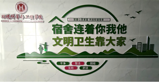 文化墙整体设计清新自然,以绿色为主色调,传递了环境学院所提倡的“绿色环保”理念,搭配简约的白色背景,给人一种舒适、整洁的视觉感受。墙的上方是学院的标志和名称,彰显出学院特色。标语“搭建心灵家园,共创和谐宿舍”醒目地提醒着同学们和谐宿舍环境的重要性。