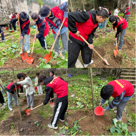 活动当天,学生志愿者与社区居民分工协作,对军转小区内长期闲置的荒废菜地进行集中清理。同学们挥锹铲土、扶苗培土、提水浇灌……现场热火朝天,原本杂乱的荒地逐渐被整齐的树苗点缀,新绿映衬着志愿者的红马甲,成为春日社区一道亮丽风景。