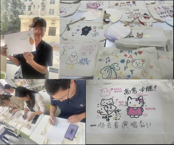 艺术创作让个性表达与情绪共鸣。在艺术创作活动中,DIY帆布包、漆扇绘制、蓝染体验处围满了参与者。学生们拿起画笔认真地在帆布包上勾勒个性图案,或用丙烯颜料在扇面描绘山水花鸟,或沉浸于蓝染的“扎染-浸染-氧化”魔法中,见证白布从靛蓝到冰裂纹的色彩蜕变。现场一位老师也参与其中,与学生合作完成一幅漆扇作品:“艺术创作没有标准答案,就像情绪需要被看见和接纳。”