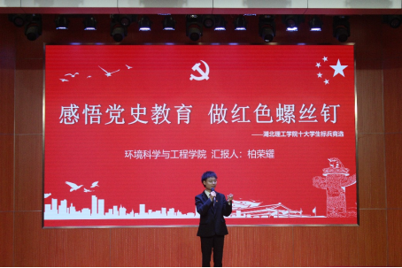 下午两点半,柏荣耀代表环境学院为候选人参加先进事迹演讲,以“感悟党史教育,做红色螺丝钉”为题,首先进行个人简介,其次在党支部工作上以“党史学习育思想,脚踏实地追寻自我”为宗旨,一一讲述了自己参加的“春季防病宿舍消杀”、“疫苗接种”、“一对一帮扶”、“布置自修室”、“雨后迎接宜兴同学返校”等活动,再现了“我为群众办实事”。在学生工作上以“学生工作展抱负,身体力行服务群众”为宗旨,展示了自己从2018年至2021年“在校获奖情况”、“学习荣誉”、“任职荣誉”、“相关党团主题活动”等所获荣誉。在专业学习上以“专业学习显身手,勤恳治学有担当”为己任,阐述了“绿苑相关活动”、“地球熄灯一小时”、“科研经历”等专业方向的经历。最后,列举了“雷锋、张桂梅、袁隆平”等榜样的力量,号召同学们向榜样学习。至此,演讲结束。