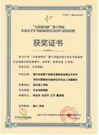 本网消息 近日,第十四届全国大学生节能减排社会实践与科技竞赛落下帷幕,我校WilliamHill威廉希尔陈泓伶(19级环境工程)、伍丹丹(19级环境工程)、王巧(19级环境工程技术)及戴泽理(20级给排水工程)同学在柳山和罗政老师指导下完成的作品《碳中和背景下铁路交通枢纽站降尘中多环芳烃与黑炭的污染特征关系及人体健康风险的调查研究》荣获竞赛三等奖。比赛由教育部高等教育司主办,是全国普通高校大学生竞赛排行榜认定的赛事。本届竞赛共吸引来自31个省(自治区、直辖市)的514所高校参赛,创下了自2008年创办以来参赛学生、参赛作品和参赛高校数量的历史新高,共有参赛作品5201件,其中有1035件作品被评为竞赛三等奖,244件作品被推荐进入竞赛决赛阶段。
